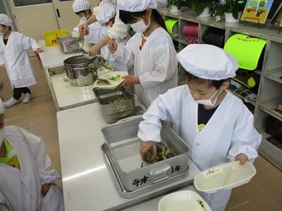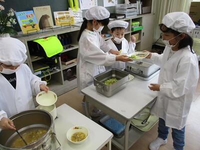 1年生の給食が18日(金)からスタートしました。初めての給食でしたが、とても上手に着替えをしたり、準備をしたりすることができました。「おいしかったよ。」「全部食べたよ。」ととても嬉しそうでした。少しずつ学校に慣れてきている1年生です。