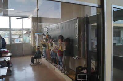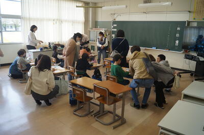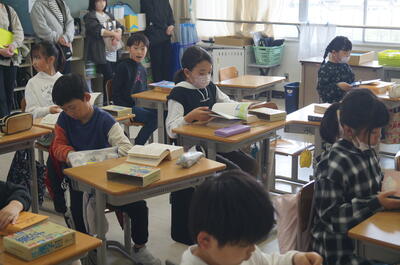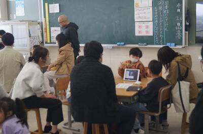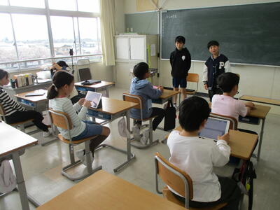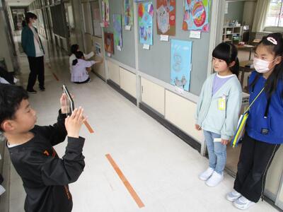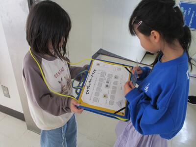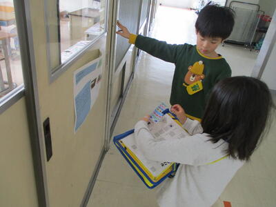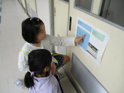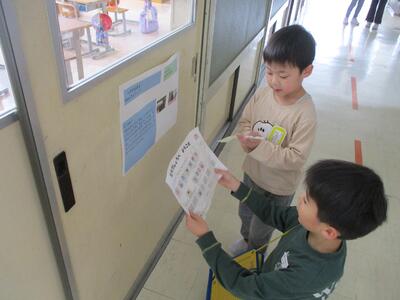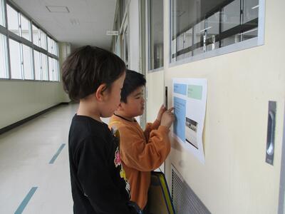 生活科の学習で、2年生が1年生に学校を案内してくれました。事前にいろいろな教室の秘密を調べてまとめ、タブレットを使って作った紹介カードをドアの前に貼って準備をしていました。ペアになって学校を回っていましたが、2年生がとてもやさしく1年生に説明していて、お兄さんお姉さんの顔になっていました。案内してもらった1年生もとても嬉しそうでした。