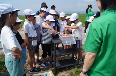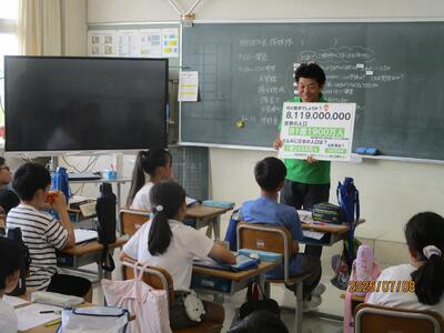 4年生の社会科の学習です。三郷堰土地改良区の方々と天童市農林課の方々に来ていただき、教室で田んぼの水についてのお話をお聞きしました。