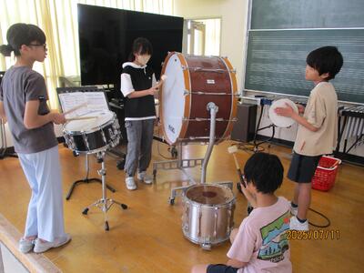 グループごとにそれぞれ楽器を選び、自分たちでリズムを考え、アンサンブル作りに取り組んでいました。
