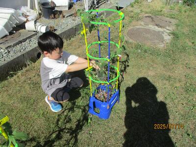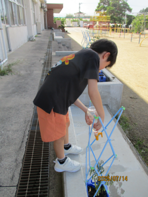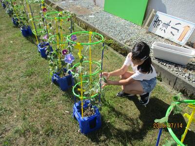 1年生はアサガオ、2年生はそれぞれが選んだ野菜を育てていて、毎日水やりを頑張っています。