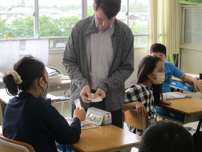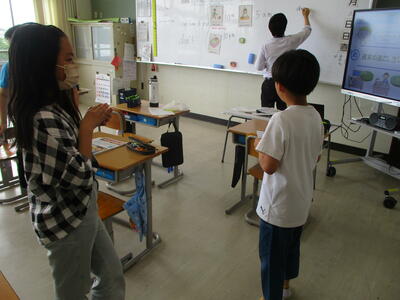 6年生の外国語の授業の様子です。ALTの先生と一緒に授業をしていました。What time do you~ を使って、週末の過ごし方について聞き合う活動を行っていました。ペアを変えながら、どんどん聞き合う様子が見られました。