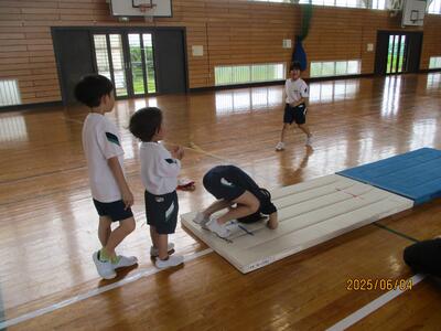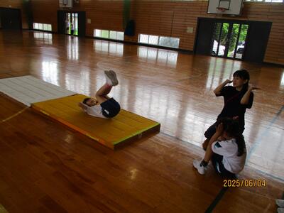 1年生が体育の授業でマット運動をしていました。「ころころのしゅぎょう」として、4つの「じゅつ」に挑戦していました。それは、①だるまころがりのじゅつ ②まるたころがりのじゅつ ③まえころがりのじゅつ ④うしろころがりのじゅつ です。最後は、みんなで協力して後片付けまで頑張っていました。