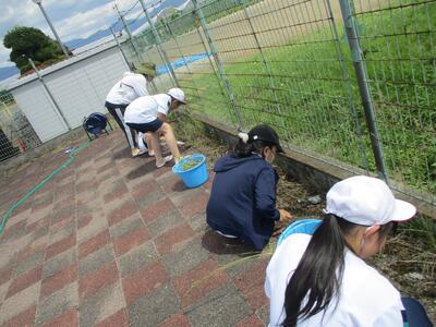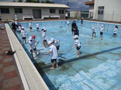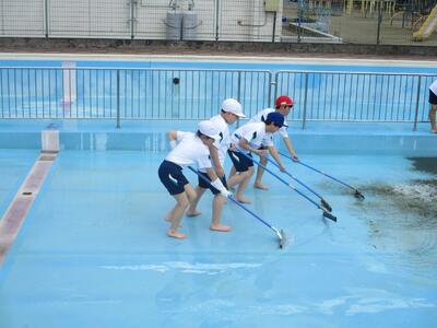 今日の5時間目に、4,5,6年生でプール清掃を行いました。プールの床、壁、更衣室、トイレ、草取りなど、役割分担を決めて取り組みました。みんなが気持ちよくプールを使うことができるように、真剣に、一生懸命作業する子どもたちを見て、とても嬉しく、頼もしく思いました。