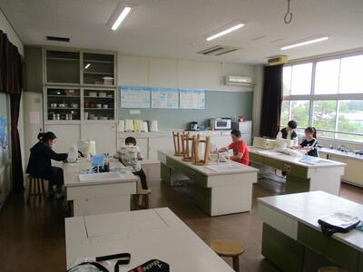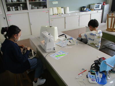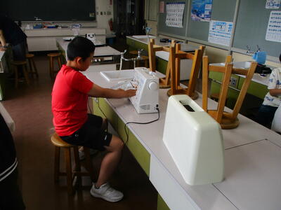 6年生が家庭科の時間に、ミシンを使って作業をしていました。トートバックを作っている人と、ナップザックを作っている人がいました。さすが6年生、上手にミシンを操作していました。