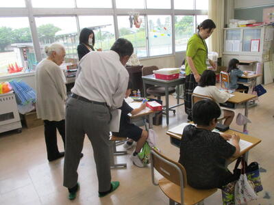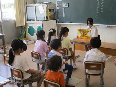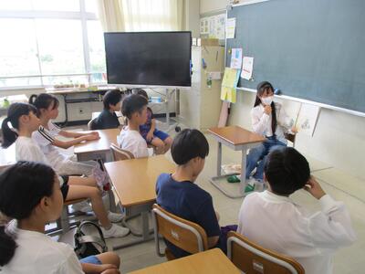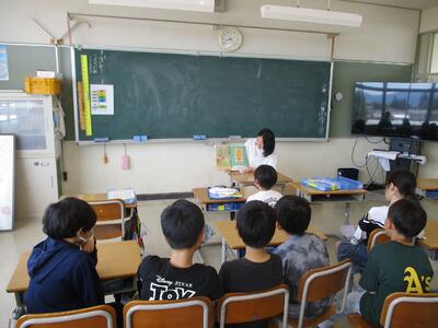 今日は、4名の中学生の皆さんが読み聞かせに来てくれました。寺津小学校の卒業生のみなさんです。1年生から4年生までのクラスで読み聞かせをしてくれました。子どもたちはみんな集中して聞いていました。中には、絵本を指さしながら、質問に答える場面もありました。わざわざ来てくれた中学生の皆さん、本当にありがとうございました。