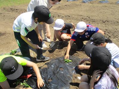 5年生が、技能技師の先生に教えていただきながら、畑にサツマイモの苗を植えていました。また、前に植えたニンジンの芽が出ていて、嬉しそうでした。他にも、大豆やキャベツもあるようです。この野菜をどうするのか聞いてみたところ、「みそ汁の具材にする。」とのこと。家庭科の調理実習で使う予定のようです。「味噌もつくれるかなあ。」という声も。どんな使い道になるのか楽しみですね。