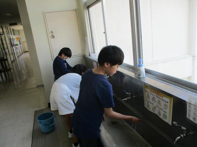 3時間目の終り頃、4年生が水場の清掃をしていました。どうしたのか聞いてみると、習字をしたあとに汚れたのできれいにしているとのことでした。自分たちで使った場所を自分たちでしっかりきれいにするのは大事なことですね。