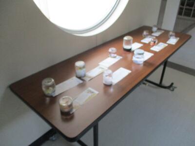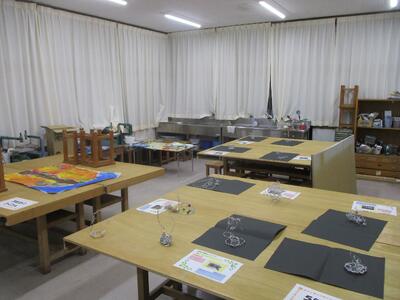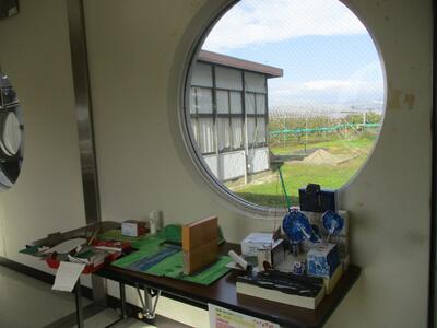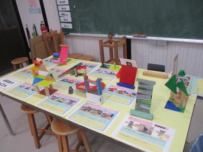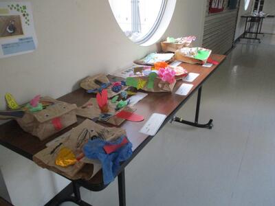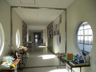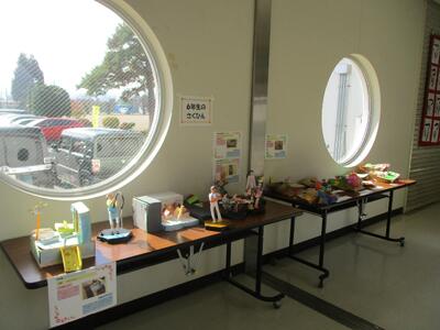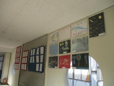 図工室と渡り廊下に、児童の作品が展示してあります。各学年の絵画や工作、そして、図工クラブの作品も展示してあります。