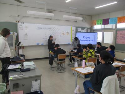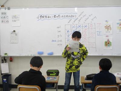 6年生が「小学校生活の一番の思い出を伝え合おう」というめあてで、外国語の学習をしていました。修学旅行や運動会など、一人一人の一番の思い出を英語で発表し合っていました。