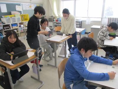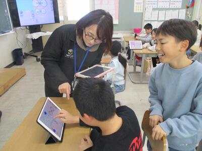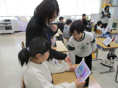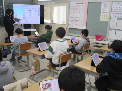3年生が、ICT支援員の先生から教えていただきながら、プログラミングの学習をしました。基本的なやり方を教わった後は、自分でキャラクターを描き、いろいろ試していました。自分なりに考え、工夫し、楽しみながら、プログラミングの技能を習得していく子どもたちでした。