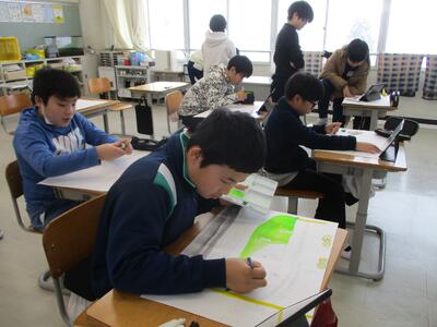 6年生が図工の時間に、「わたしの大切な風景」というテーマで、絵を描いていました。学校の中で自分の思い入れの強い場所を選んでいる人が多かったようです。6年間過ごしてきた校舎での様々な出来事を思い浮かべながら描いていたのではないでしょうか。