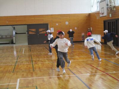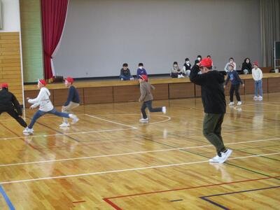 冬の時期は遊ぶ場所が限られてしまい、あまり体を動かせないので、この「全校おにごっこ」を計画したとのことでした。今日は、上学年のみなさんが思い切り体を動かしながら、楽しんでいました。