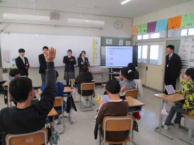 クイズ形式で中学校のことを説明したり、中学校の校歌を歌ってくれたり、質問コーナーでは、6年生の質問に丁寧に答えてくれたりしていました。家庭での勉強時間を聞いて「そんなに!」との声も。