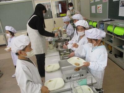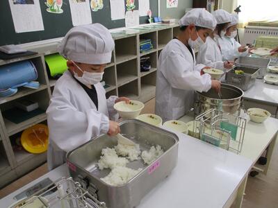 今日から1年生の給食が始まりました。初めての給食準備でしたが、身支度や盛り付けがとても上手にできました。