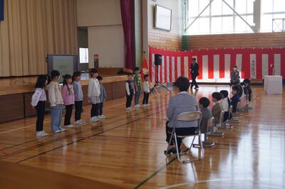 代表児童が、1年間の振り返りを発表しました。自分のキーワード「挑戦」について、しっかり振り返りができていました。